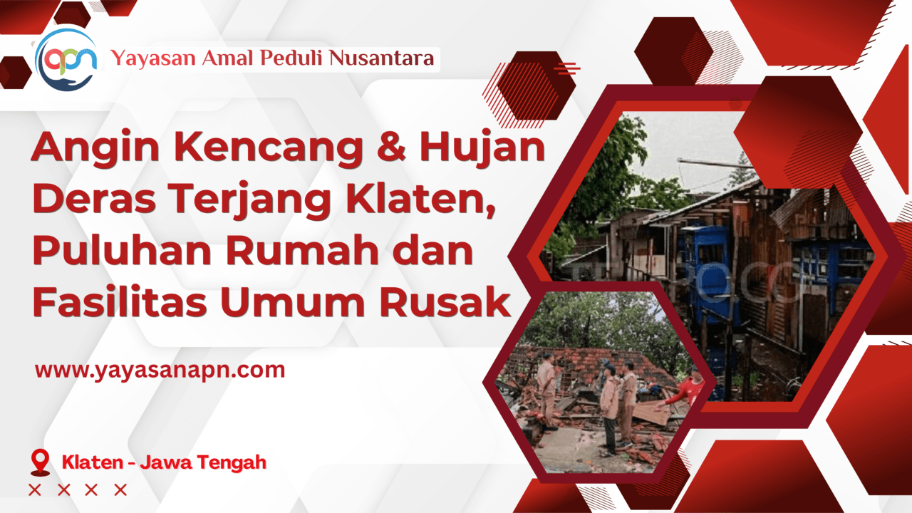 Klaten, Jawa Tengah — Cuaca ekstrem berupa hujan deras disertai angin kencang menerjang wilayah Kabupaten Klaten pada periode 31 Maret hingga 1 April 2026, menyebabkan kerusakan di sejumlah permukiman dan fasilitas umum di lima kecamatan.