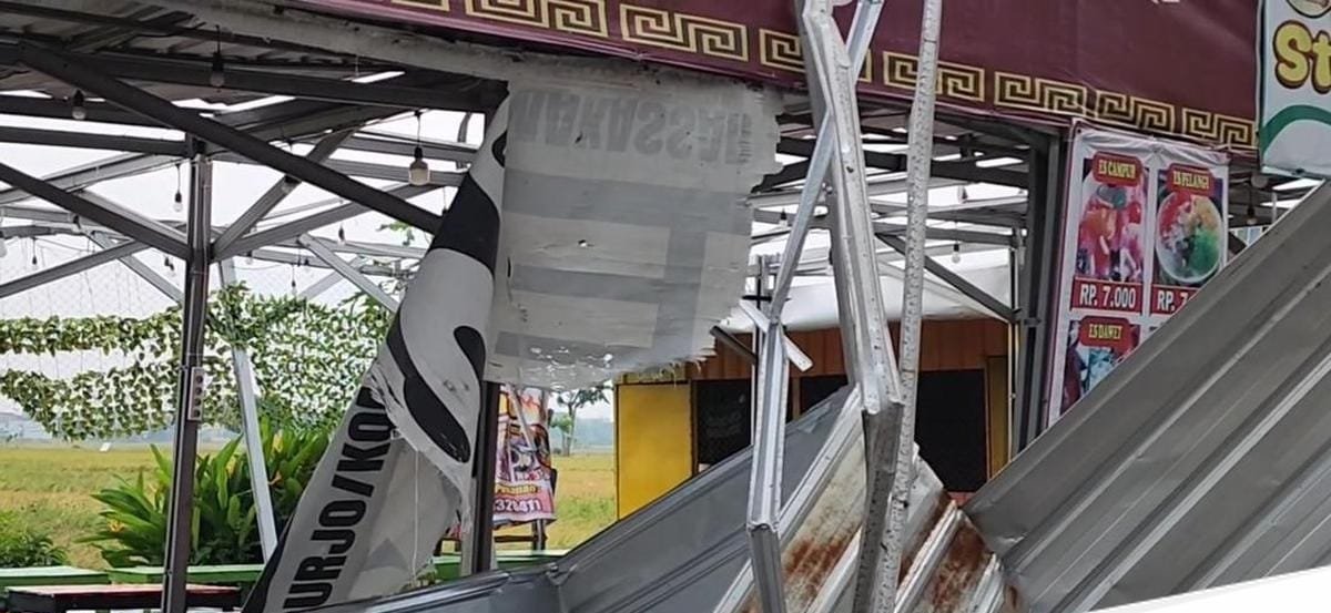 Genteng beterbangan, atap rumah terangkat, dan beberapa bangunan semi permanen roboh diterjang angin.