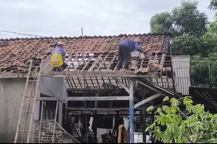 ( Dokumentasi : Sejumlah warga sedang memperbaiki kerusakan rumah akibat diterjang angin ribut di Desa Cisaat, Kecamatan Campaka, Kabupaten Purwakarta, Foto bersumber dari situs Lensapurwakarta )