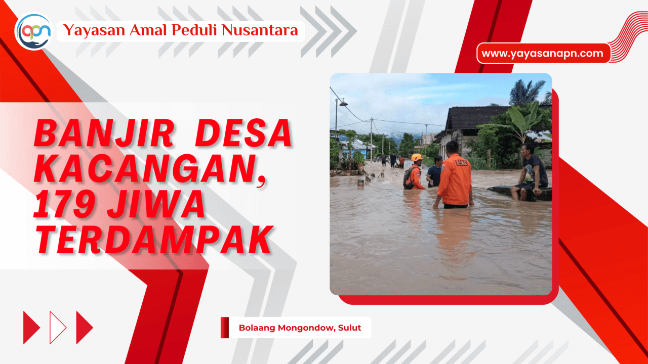 Hujan deras yang mengguyur wilayah Kabupaten Bolaang Mongondow, Sulawesi Utara, pada Sabtu, 20 September 2025 menyebabkan banjir di Desa Kacangan, Kecamatan Bolaang. Sebanyak 179 jiwa dari 60 Kepala Keluarga (KK) harus menghadapi luapan air setinggi 40–50 cm yang masuk ke rumah mereka.