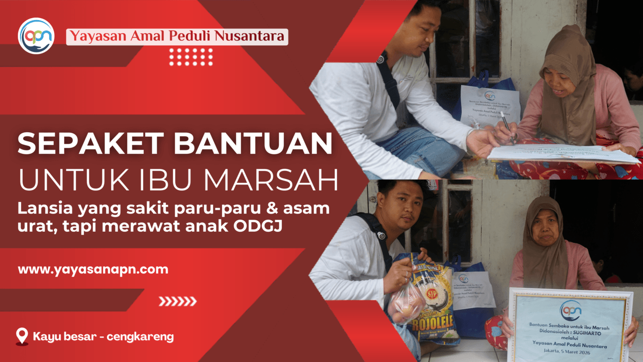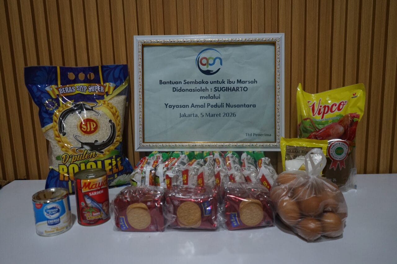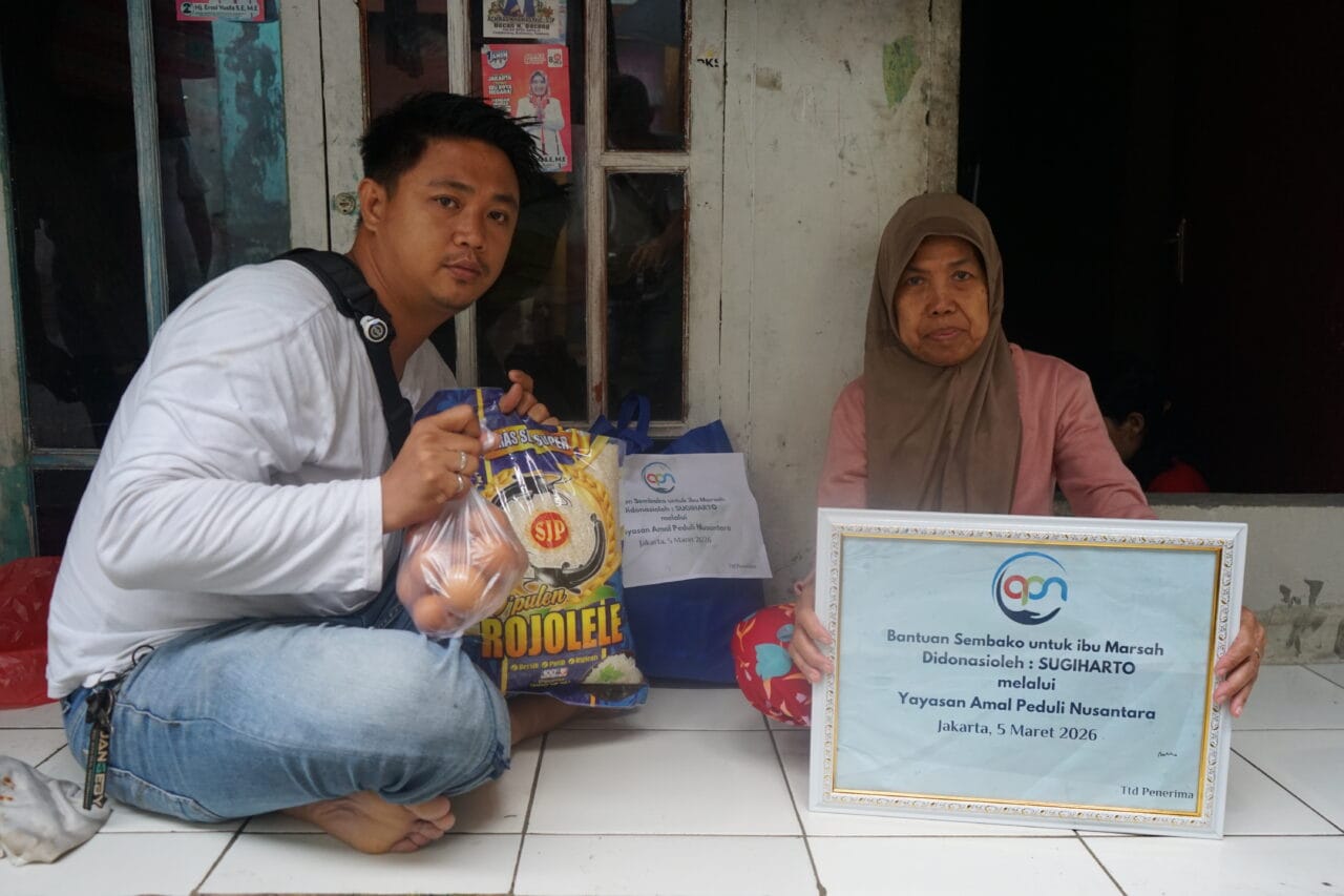 Yayasan Amal Peduli Nusantara kembali menyalurkan bantuan kemanusiaan berupa paket sembako kepada masyarakat yang membutuhkan. Kali ini bantuan diberikan kepada seorang lansia bernama Marsah (68), yang tinggal di wilayah Kayu Besar, Cengkareng, Jakarta Barat.