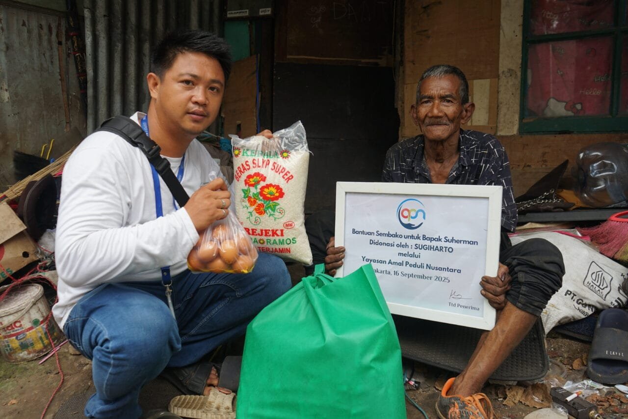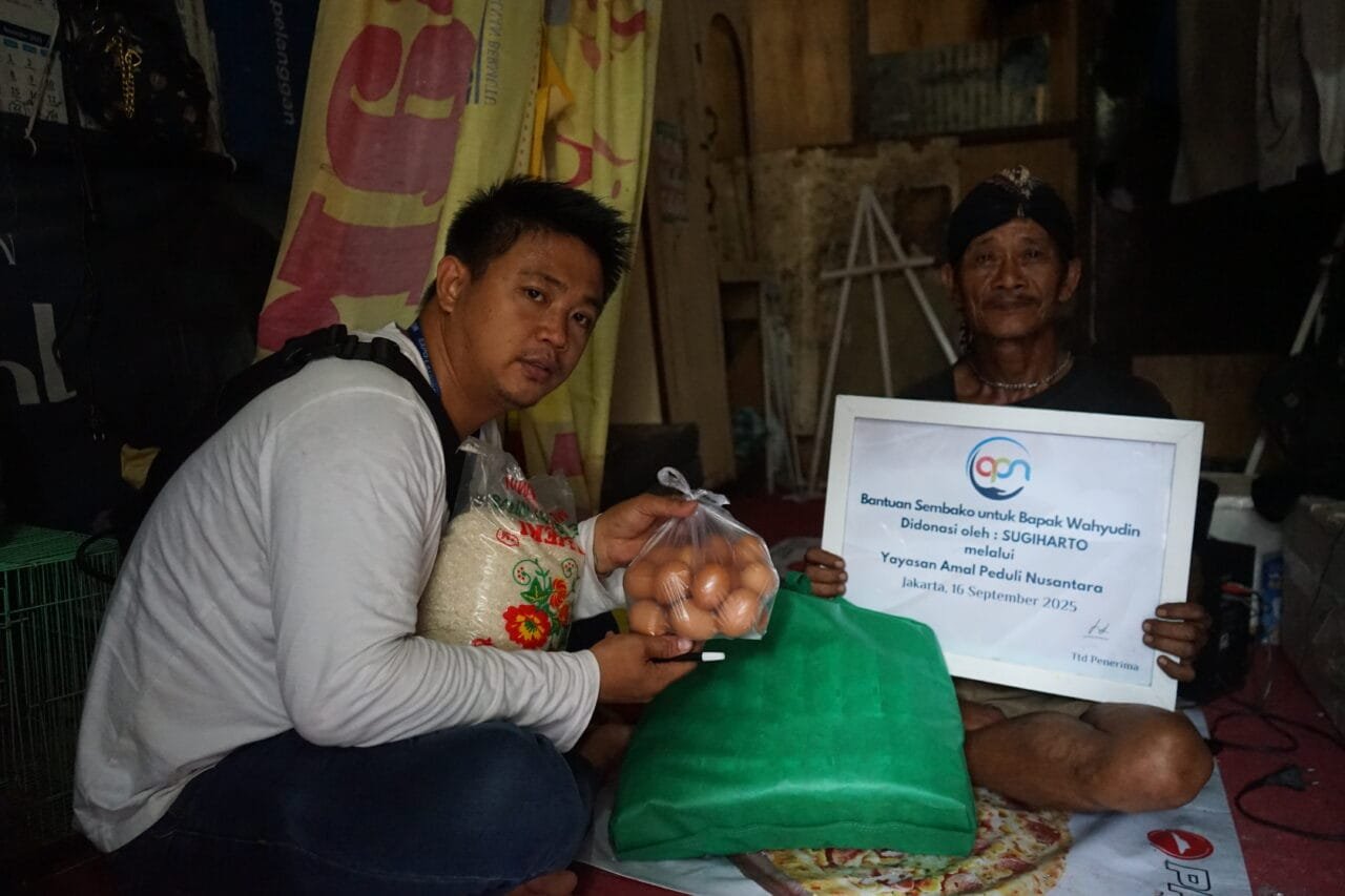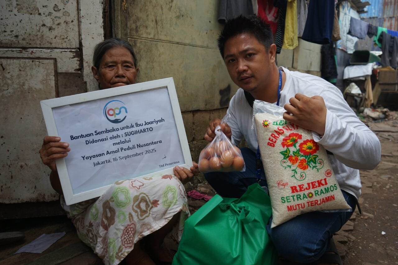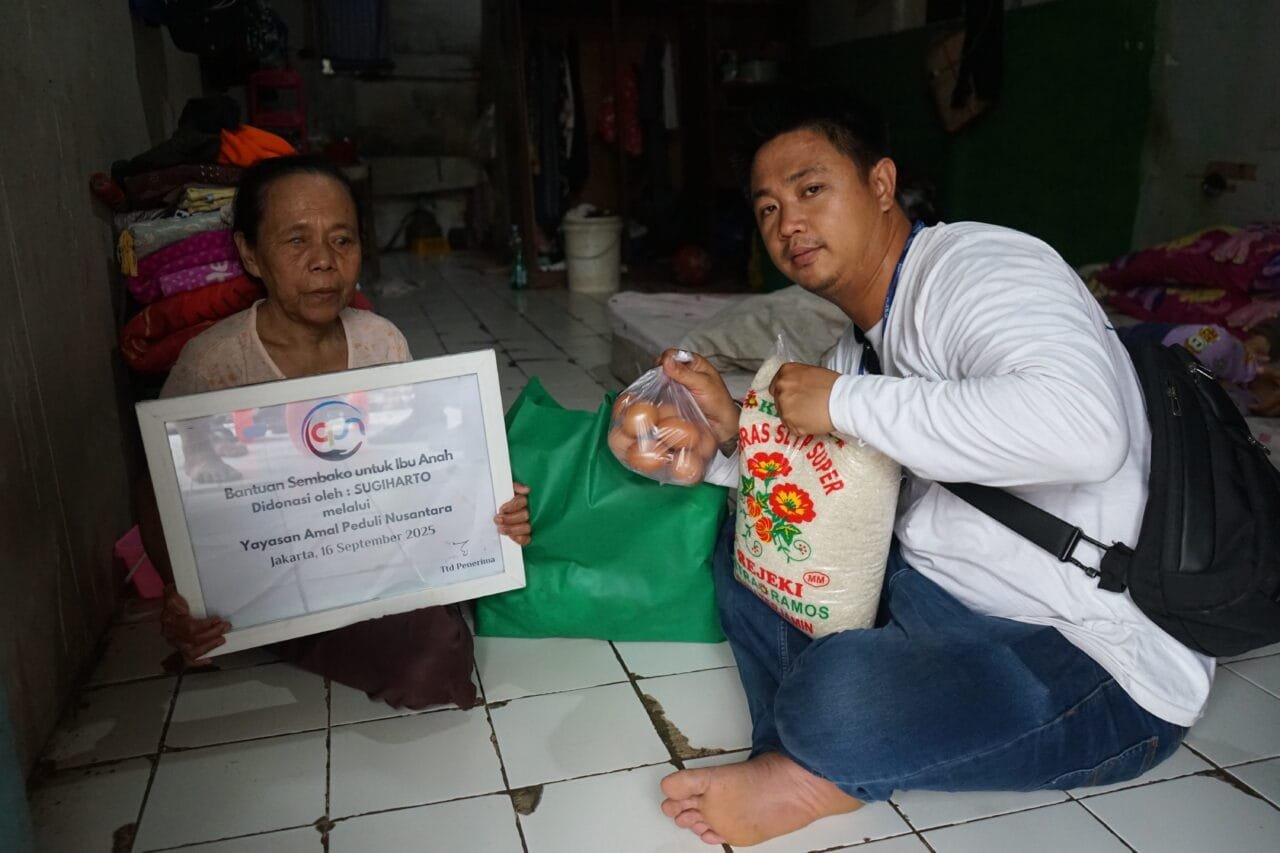 Pada hari ini, Yayasan Amal Peduli Nusantara menyerahkan bantuan paket sembako yang berisi beras, minyak goreng, mie instan, sarden, susu kental manis, telur, garam, dan biskuit regal. Bantuan ini diberikan langsung kepada lima penerima yang selama ini hidup dalam keterbatasan.