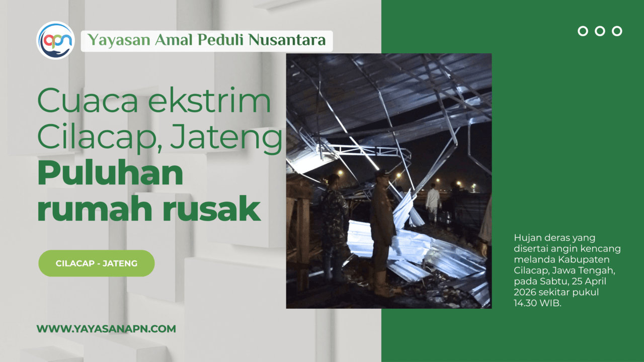 Cilacap, Jawa tengah – Hujan deras yang disertai angin kencang melanda Kabupaten Cilacap, Jawa Tengah, pada Sabtu, 25 April 2026 sekitar pukul 14.30 WIB. Cuaca ekstrem yang berlangsung cukup lama ini menyebabkan kerusakan di sejumlah wilayah permukiman warga dan memaksa sebagian keluarga mengungsi demi keselamatan.