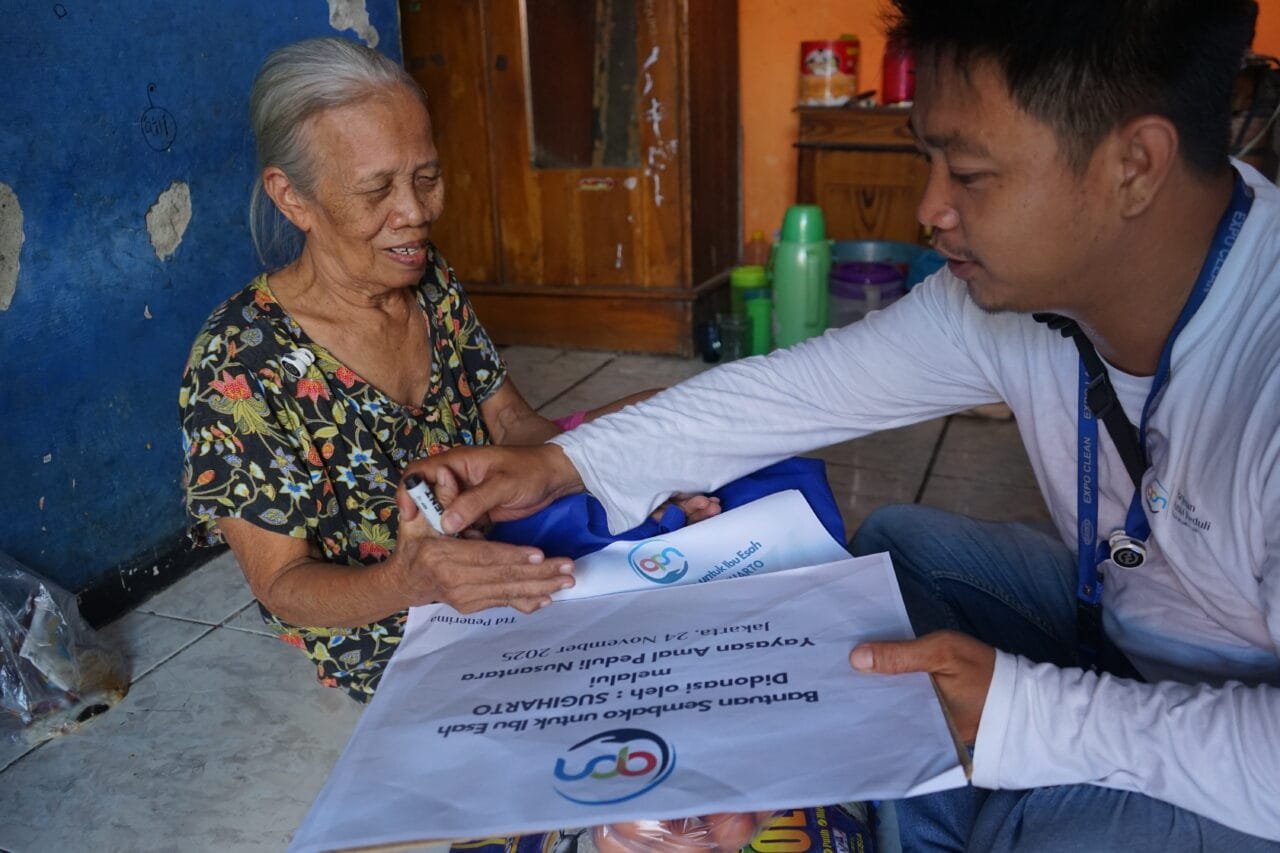 Penerima pertama adalah Ibu Esah, berusia 73 tahun. Beliau hidup bersama satu anak yang tidak bekerja. Dua anak lain hanya bisa membantu seadanya, sementara dua lainnya tidak dapat memberikan bantuan karena kesulitan ekonomi. Selama ini, kehidupan Ibu Esah banyak terbantu oleh kebaikan warga sekitar.