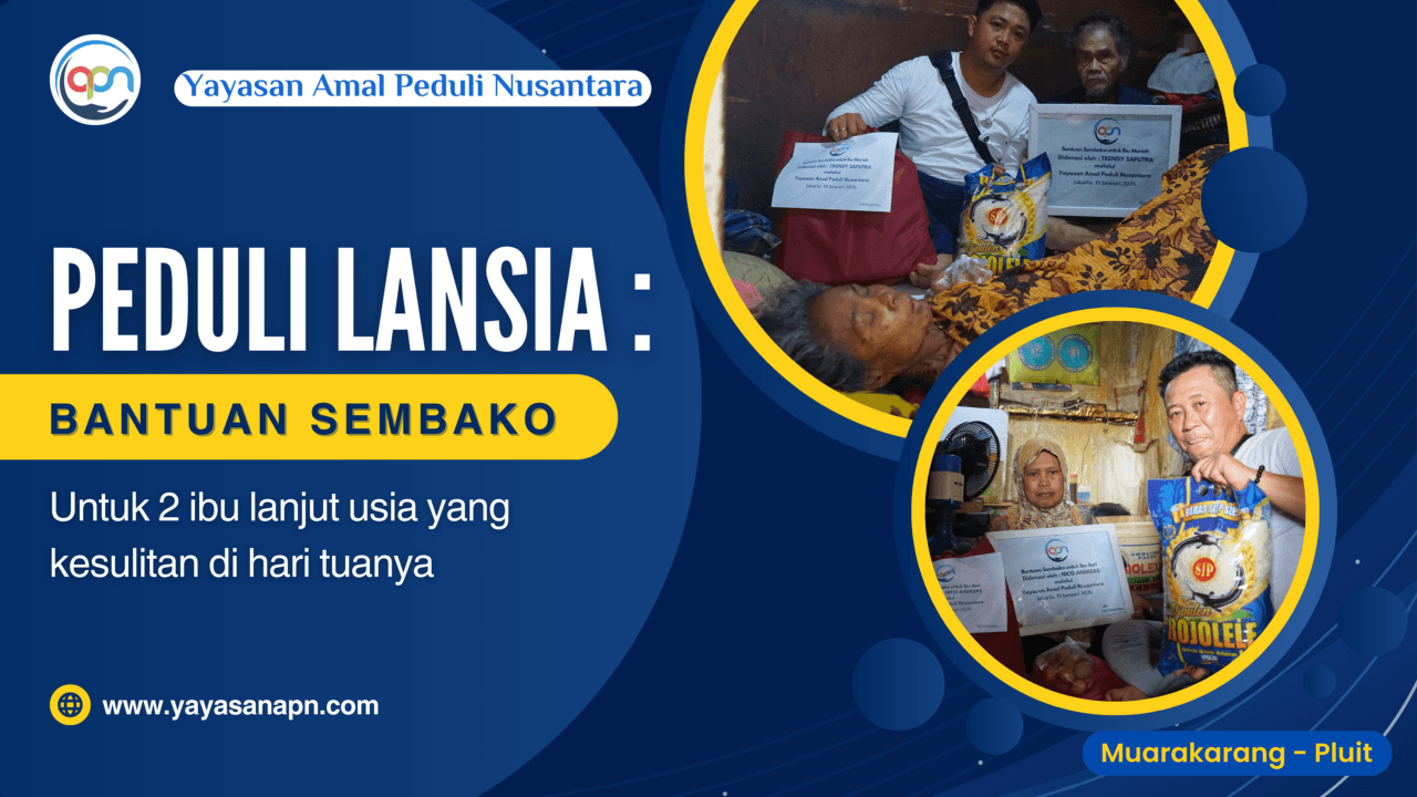 Yayasan Amal Peduli Nusantara menyalurkan bantuan paket sembako kepada dua lansia yang membutuhkan di wilayah Muara Karang dan Pluit. Bantuan ini diharapkan dapat membantu mencukupi kebutuhan harian dan meringankan beban hidup para penerima.