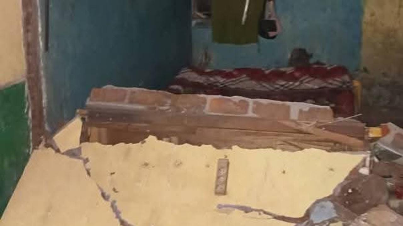 - Atap runtuh, dinding pecah, dan struktur bangunan melemah