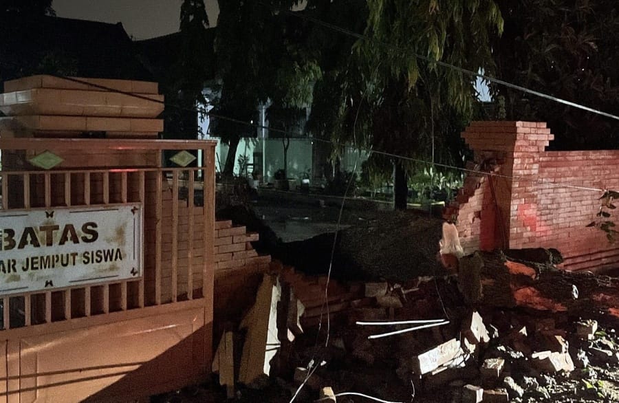 ( Dokumentasi : Hujan deras disertai angin kencang menimpa pagar tembok SD Jabon di Desa Jabontegal, Kecamatan Pungging-dok BPBD Kab Mojokerto, Foto bersumber dari situs Disway/BPBD )