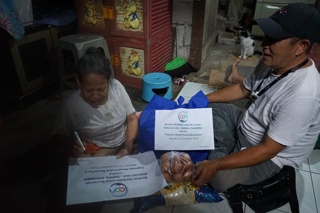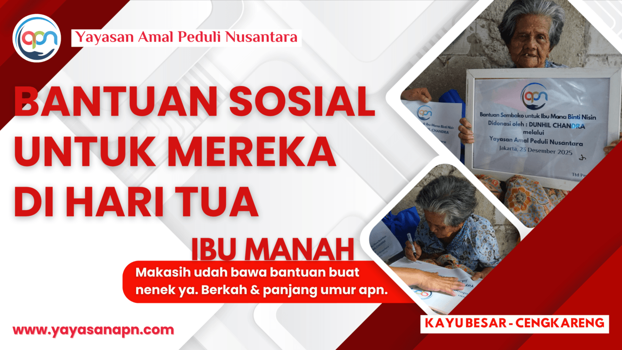 Bantuan sembako Amal peduli Nusantara kembali disalurkan kepada warga lansia yang membutuhkan. Kali ini, bantuan diberikan kepada dua orang lansia di wilayah Kayu Besar, Kapuk, Cengkareng, Jakarta Barat, yang menjalani kehidupan sehari-hari dengan keterbatasan kondisi ekonomi dan kesehatan.