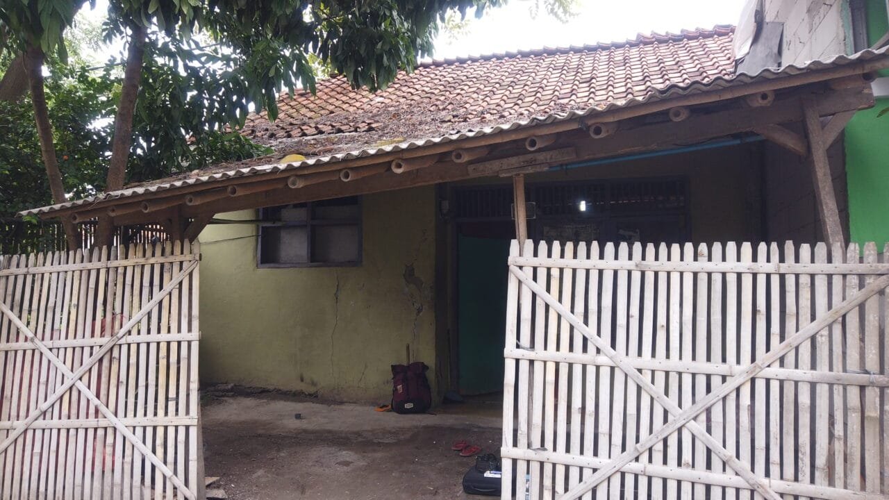 ( Dokumentasi : ‘Rumah Ibu Surya tampak depan’ dengan atap yang miring sebelah dan akan dibenahi juga )