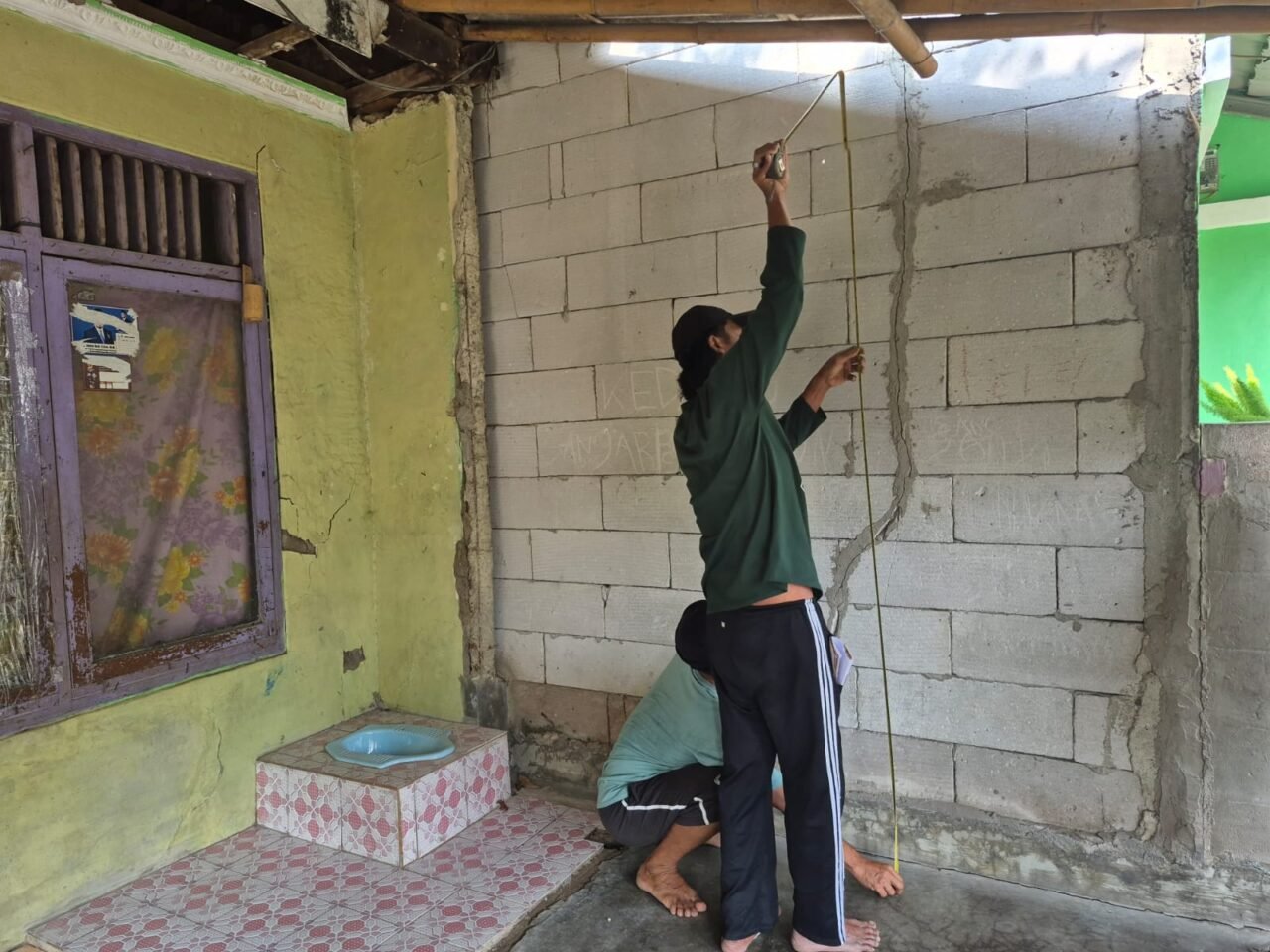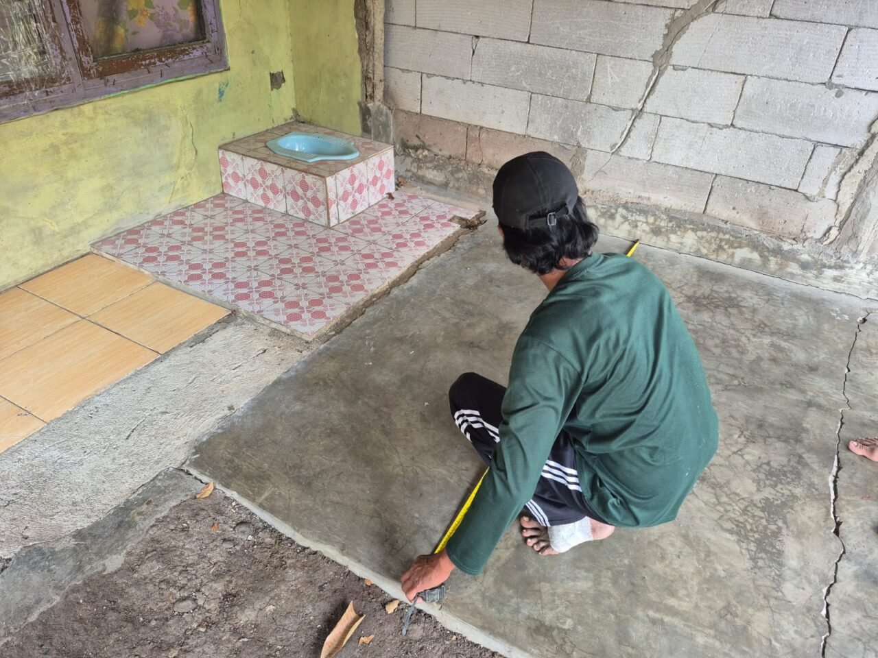 ( Dokumentasi : Tukang yang mengukur segala yang dibutuhkan untuk perbaikan dan pembuatan toilet )