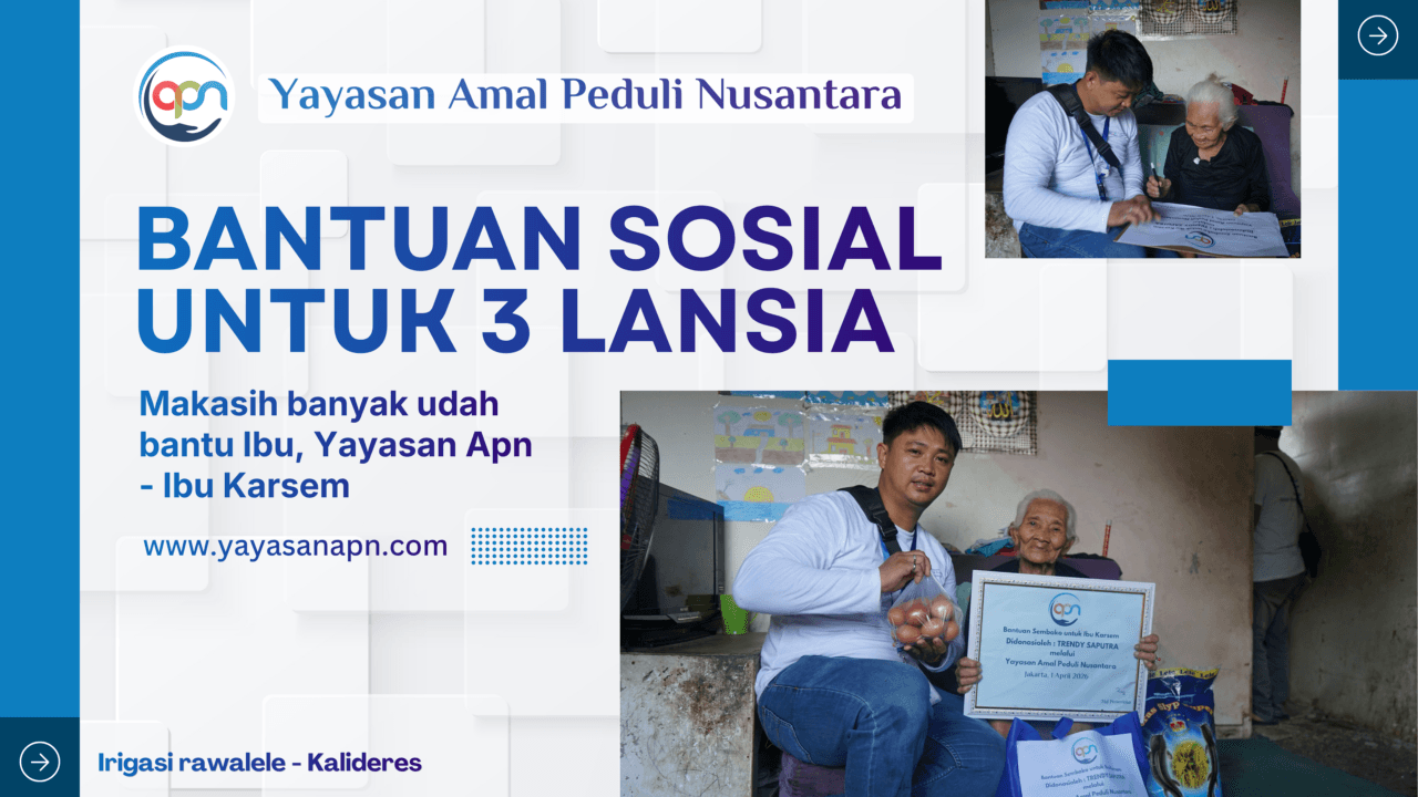Yayasan Amal Peduli Nusantara kembali menyalurkan bantuan sembako kepada masyarakat yang membutuhkan. Kali ini, bantuan diberikan kepada tiga lansia di wilayah Irigasi Rawalele, Kalideres, yang hidup dalam kondisi serba terbatas.