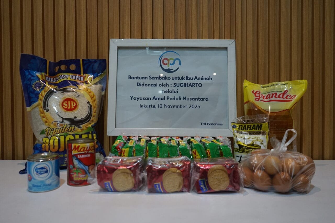 Melihat kenyataan itu, Yayasan Amal Peduli Nusantara hadir membawa sedikit kebaikan — berupa bantuan sembako yang berisi beras, minyak goreng, mie instan, sarden, susu kental manis, telur, garam, dan biskuit Regal.