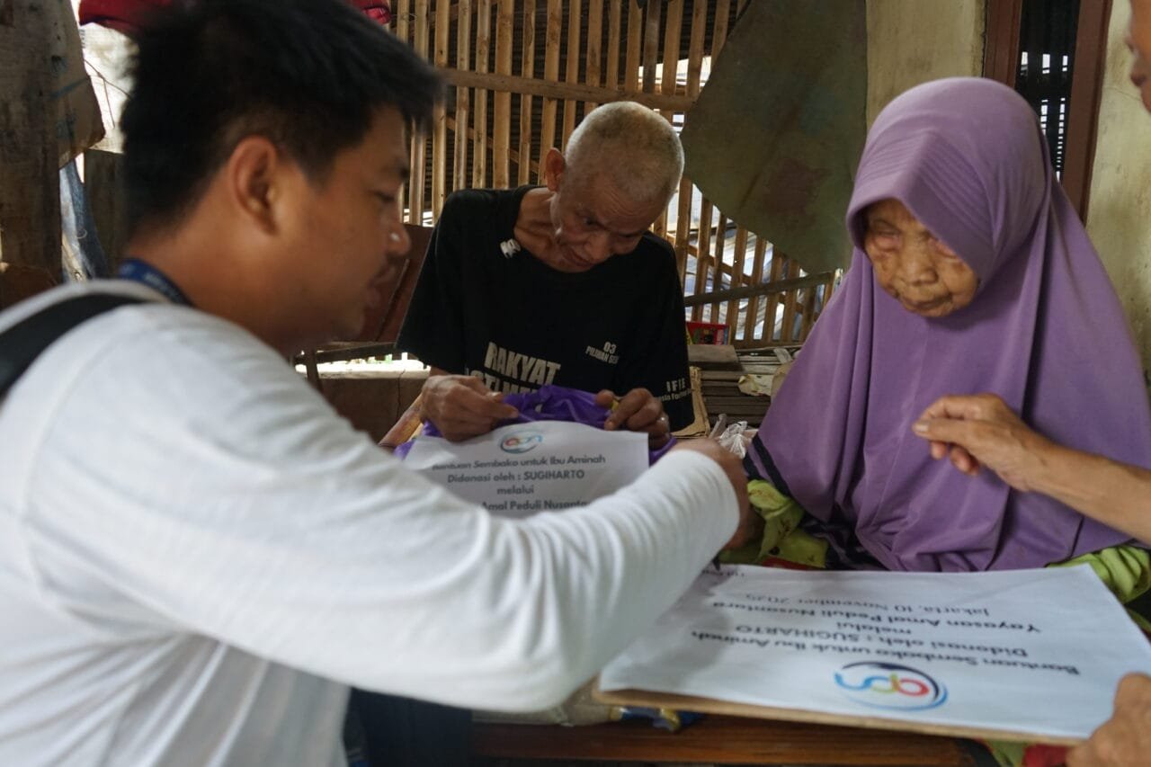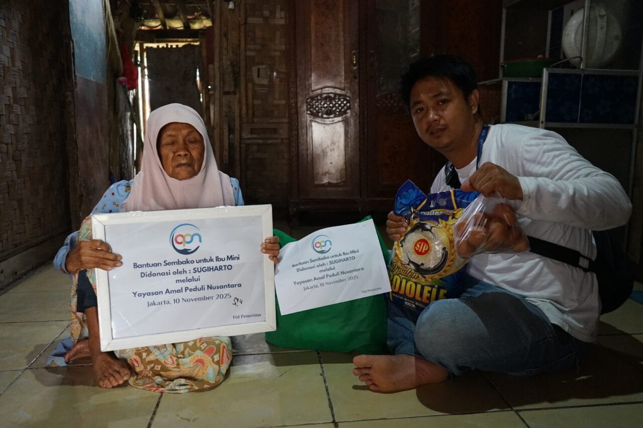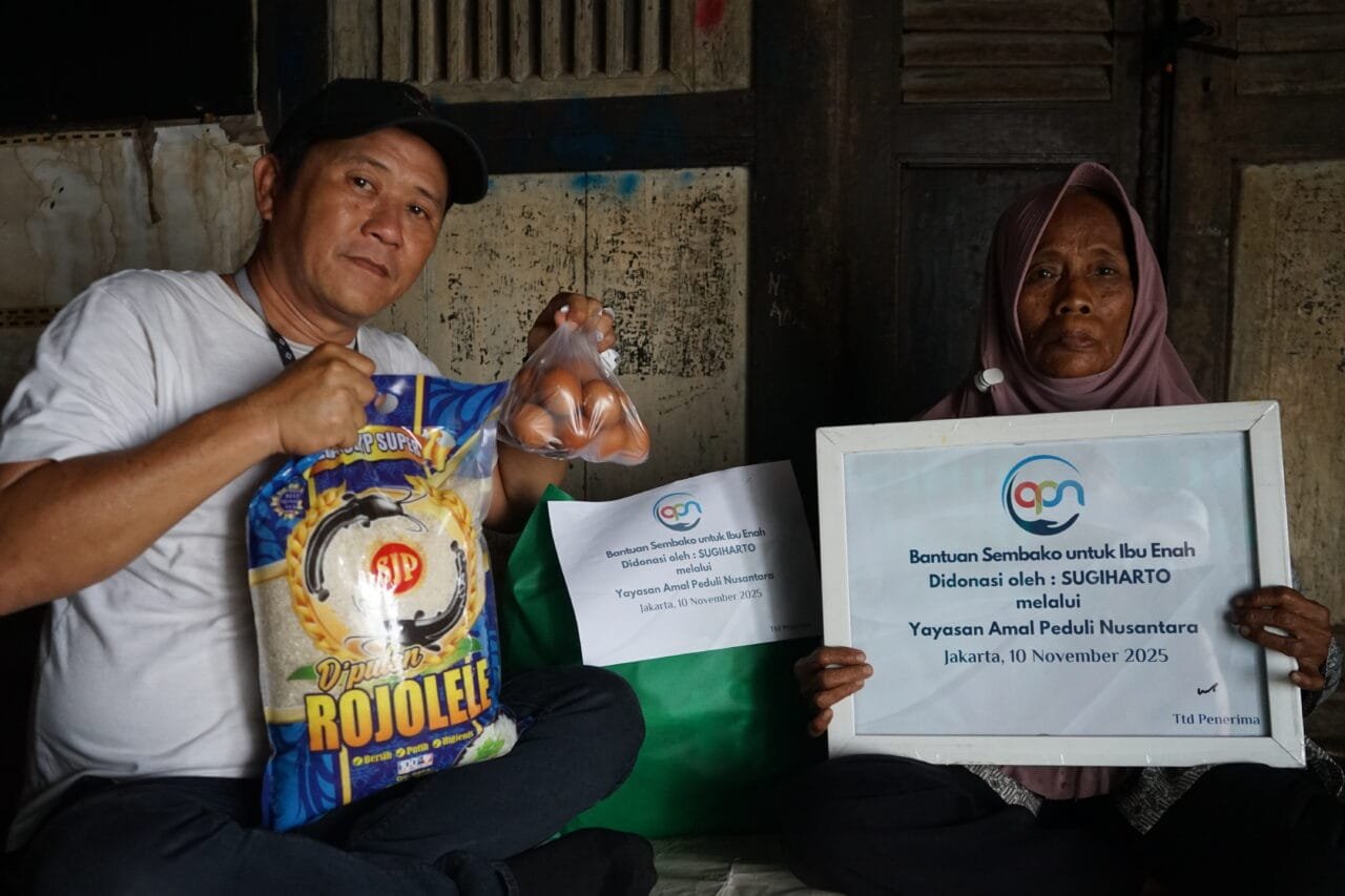 Hidup Ibu Aminah pun penuh tantang, kesulitan bicara dan mendengar. Ia merawat satu-satunya anak yang mengalami kelumpuhan. Tanpa penghasilan tetap, mereka hanya bergantung pada bantuan warga sekitar. Saat menerima sembako dari Yayasan Amal Peduli Nusantara, air matanya menetes pelan. “Alhamdulillah, terima kasih banyak ini sangat berarti buat ibu dan saya,” kata anaknya dengan suara bergetar.