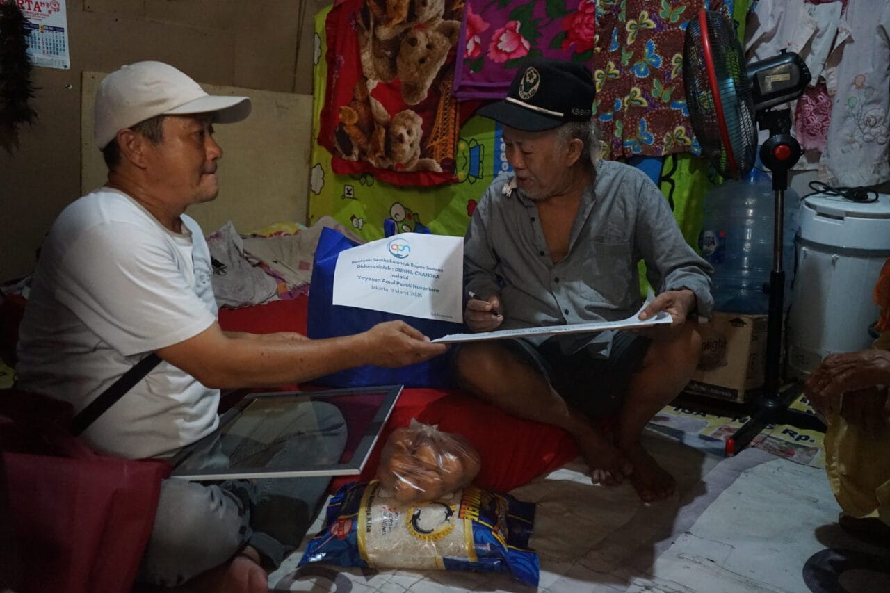 Bantuan juga diberikan kepada Yasin (70 tahun) yang tinggal di wilayah Kapuk, Cengkareng. Ia masih bekerja sebagai tukang sampah dengan upah yang rendah setiap bulannya. Pak Yasin tinggal bersama istrinya dan tidak memiliki anak, sehingga di usia yang sudah lanjut, ia tetap harus berusaha bekerja demi bertahan hidup.