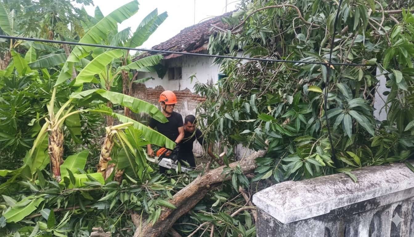 Bantuan awal dari BPBD Pasuruan telah masuk ke lokasi. Petugas bersama warga bergotong-royong menyingkirkan puing dan memotong pohon tumbang.