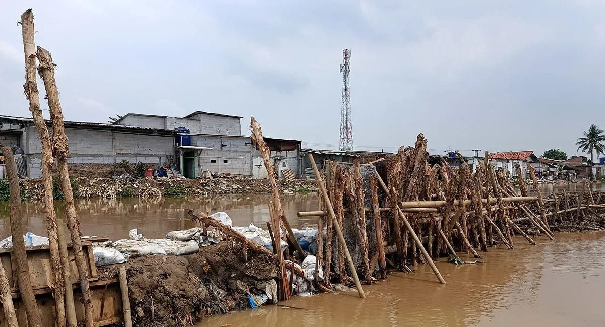 ( Dokumentasi : Kondisi Tanggul Kali Srengseng di Desa Sukamanah, Kecamatan Sukatani, Kabupaten Bekasi, tampak lebih surut debit airnya usai jebol, foto bersumber dari situs Poskota )
