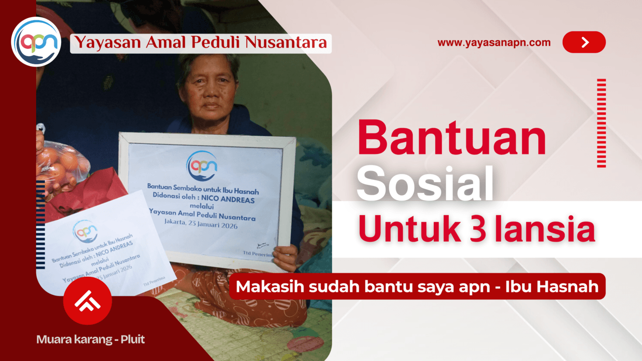 Yayasan Amal Peduli Nusantara terus mendistribusikan bantuan sembako kepada para lansia yang membutuhkan, Kali ini di wilayah Muara Karang,Pluit. Bantuan diberikan kepada tiga lansia yang menjalani hari-hari dengan keterbatasan ekonomi dan kondisi kesehatan yang tidak ringan.