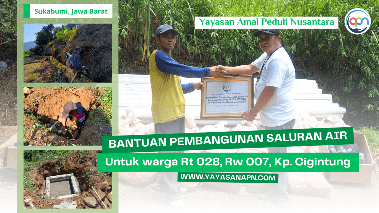 Akses air bersih menjadi salah satu kebutuhan penting yang sering kali masih sulit dijangkau di beberapa daerah. Menyadari hal itu, Yayasan Amal Peduli Nusantara kembali menunjukkan kepeduliannya dengan menyalurkan bantuan material pembangunan saluran air untuk warga RT 028, RW 007, Kampung Cigintung, Sukabumi, yang terdiri dari sekitar 520 jiwa.