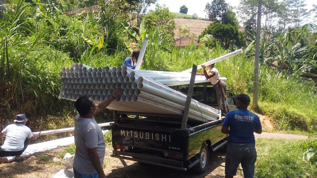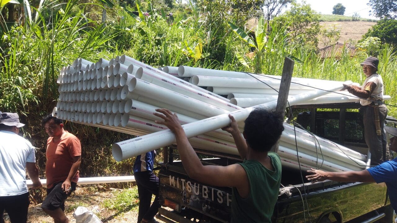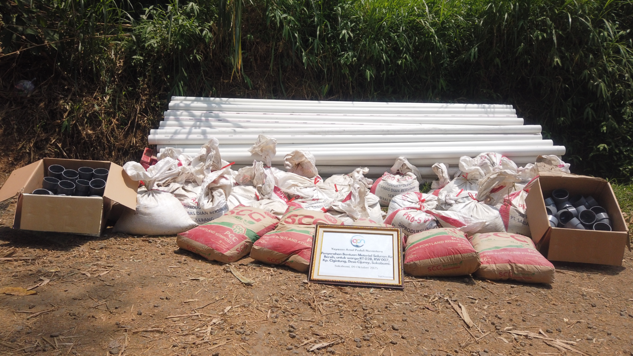 ( Dokumentasi : Bantuan bahan material pembangunan saluran air bersih, untuk warga kampung cigintung, desa cijurey, kabupaten sukabumi. )