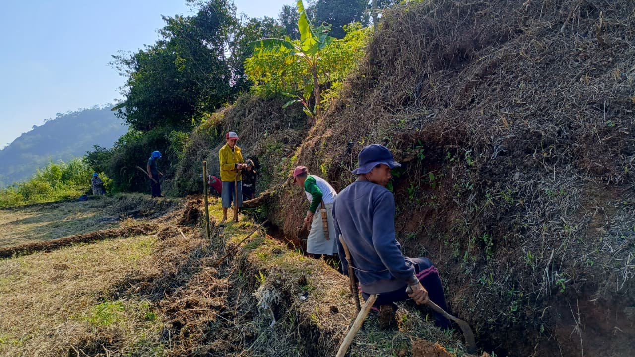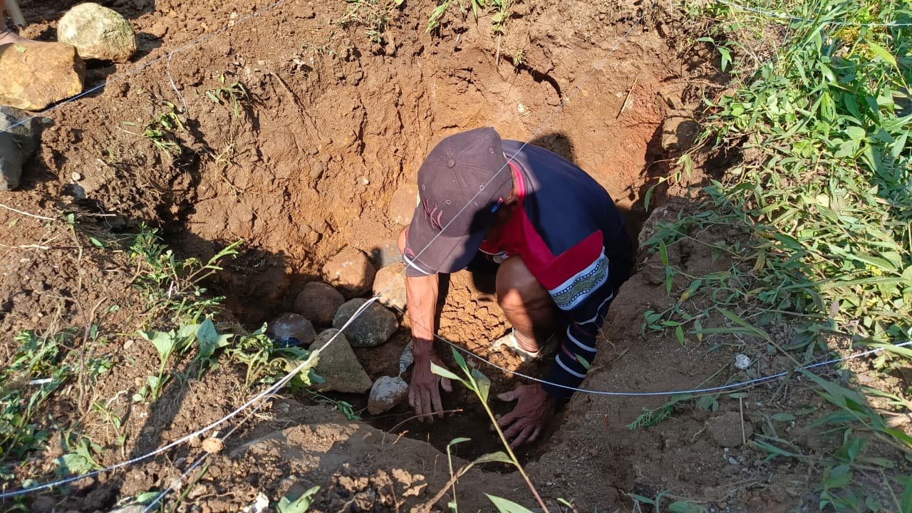 ( Dokumentasi : Proses pembangunan penampungan air ttama dan persiapan pemasangan pipa saluran air bersih untuk warga kampung cigintung, desa cijurey, kabupaten sukabumi. )